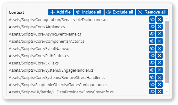 Exclusion Option: Temporarily exclude files from the context without removing them entirely. Easily re-include them later.