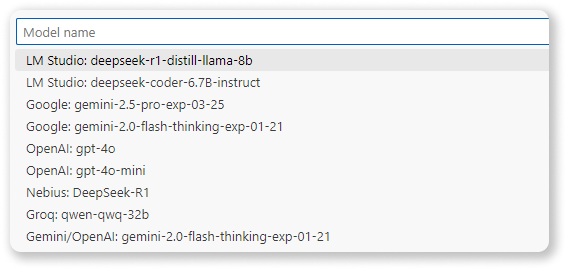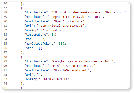 Multiple Model Definitions: Configure settings for various AI models. You can define the same base model multiple times with different parameters (like temperature, stop words, topP, max output tokens) to tailor its behavior for specific use cases (e.g., "Creative Coder" with high temperature, "Strict Code Reviewer" with low temperature and specific stop words).